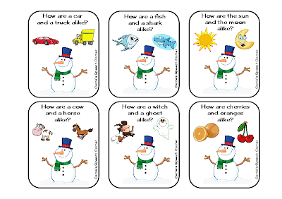 There are 18 cards, each with a snowman and two images. Instruct the students to describe the similarities between the two items. For example, in the first card, a car and a truck are alike because they are both vehicles.